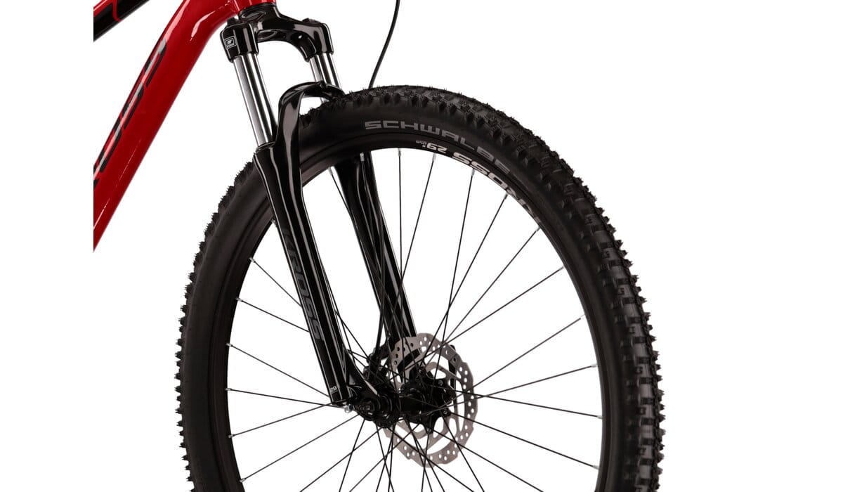 Amortyzowany widelec SR Suntour ze skokiem 100 mm zapewnia wysoką kulturę pracy oraz doskonałe tłumienie wibracji powstających podczas jazdy po nierównej i wyboistej nawierzchni.