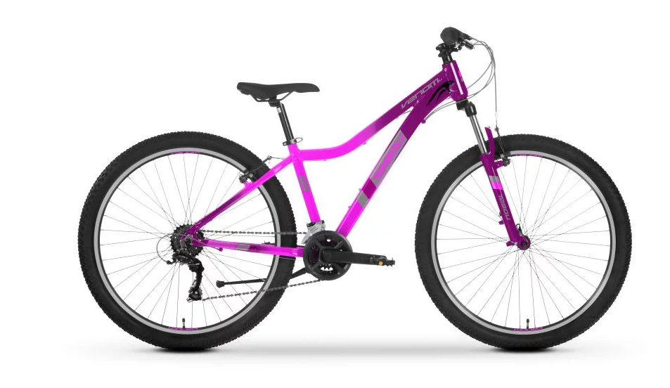 VENOM 1.0 W to propozycja damskiego, młodzieżowego roweru typu MTB. Jego uniwersalne zastosowanie pozwala na pokonywanie dłuższych tras po leśnych wyboistych drogach, ale także na miejskich ścieżkach rowerowych. Geometria ramy z obniżoną górną rurą ułatwia wsiadanie i zsiadanie, ponadto umożliwia przyjęcie wygodnej pozycji co zwiększa przyjemność z jazdy.